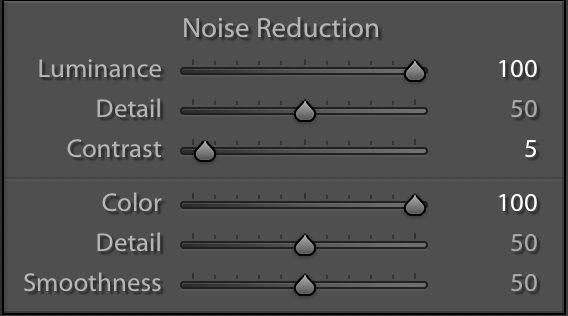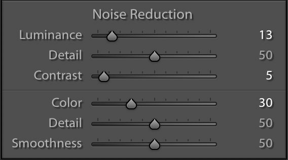 در بالا تنظیمات کاهش نویز است که در Lightroom Classic استفاده کردم. (پنل کاهش نویز قبل از آپدیت 12.3 به این شکل بود. تنها تغییر این است که به جای اینکه در بالا نوشته شده باشد Noise Reduction، اکنون می گوید Manual Noise Reduction.)
