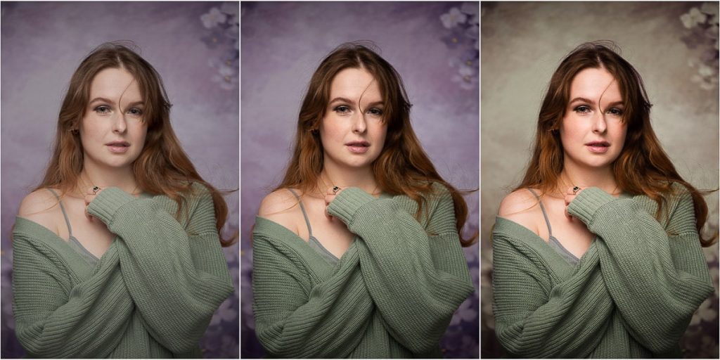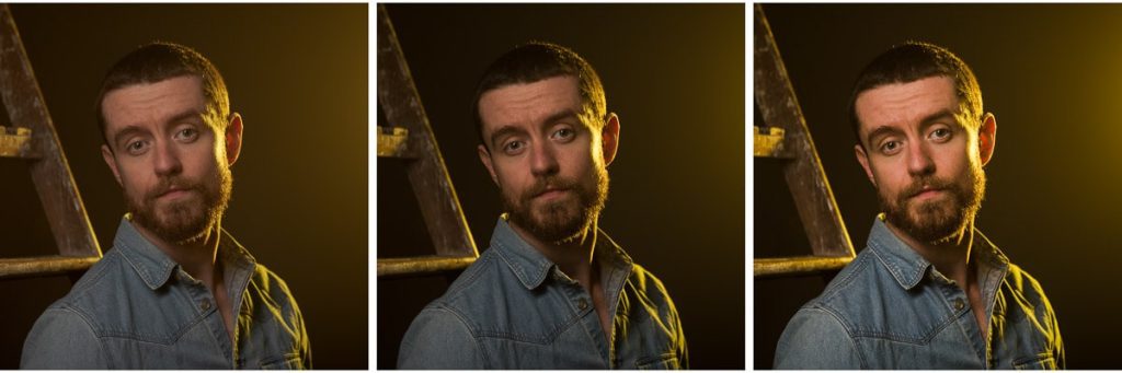 از چپ به راست: تصویر خام پردازش نشده (بسیار کسل کننده). تصویر ویرایش نشده با نمایه Adobe Color اعمال شده در هنگام وارد کردن به لایت روم. تقریباً تصویر نهایی با رنگهای پسزمینه تغییر یافته در لایت روم (برای تصویر نهایی به پایینتر مراجعه کنید)